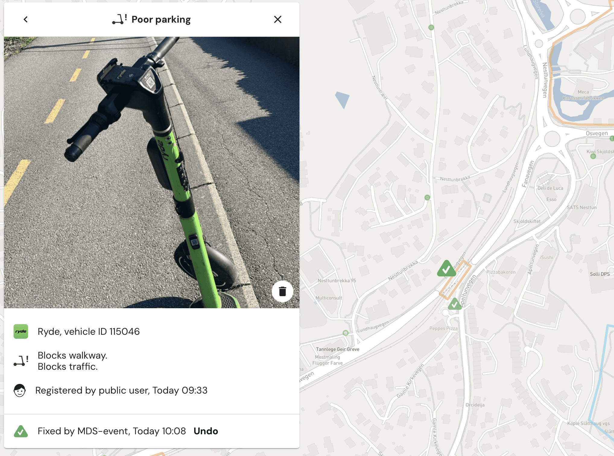 Automated fixes: A parking report will automatically be marked as Fixed if an MDS-event has occurred. This means that if the vehicle in question is being moved by e.g a user starting a new trip, the parking report is automatically resolved.