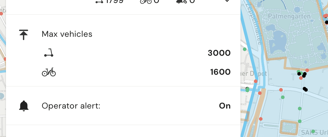 Example: The limit for e-scooters in a zone is set to 3000, and there are four operators. Each operator can then have maximum 750 e-scooters in that zone. If the system detects that operator A have 790 e-scooters in the zone, it will send out a notification to that operator, telling them to remove 40 e-scooters. The notification will be sent on e-mail, as well as appearing in the alerts list in the regulator.