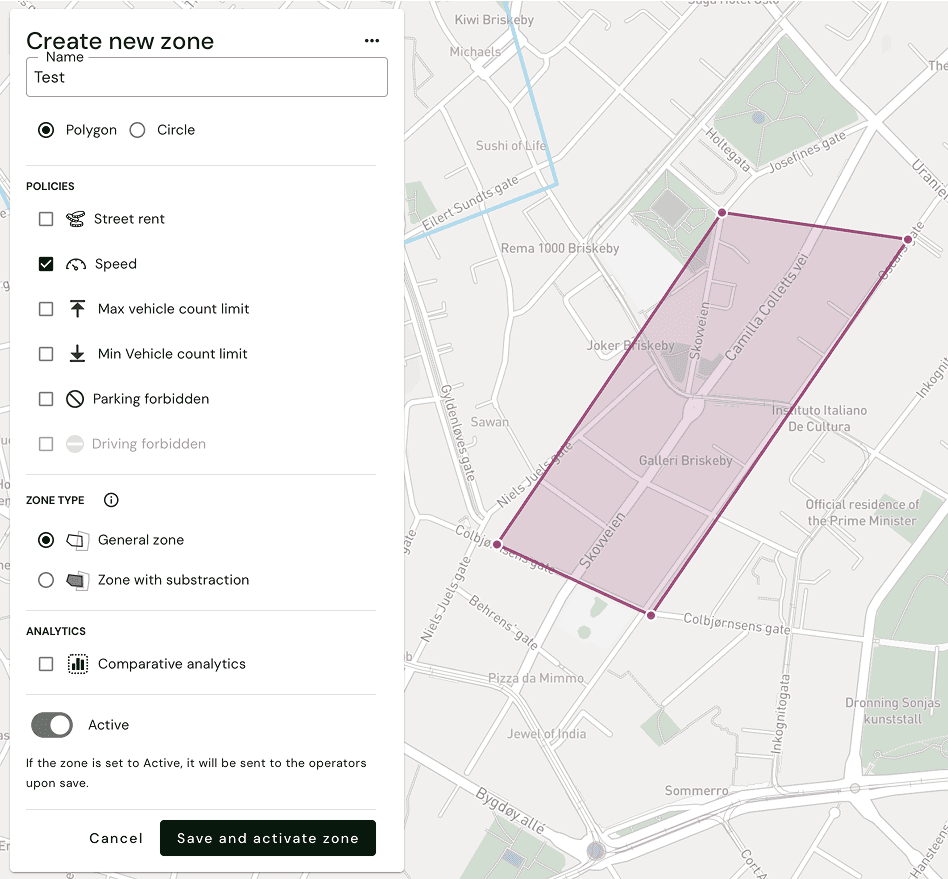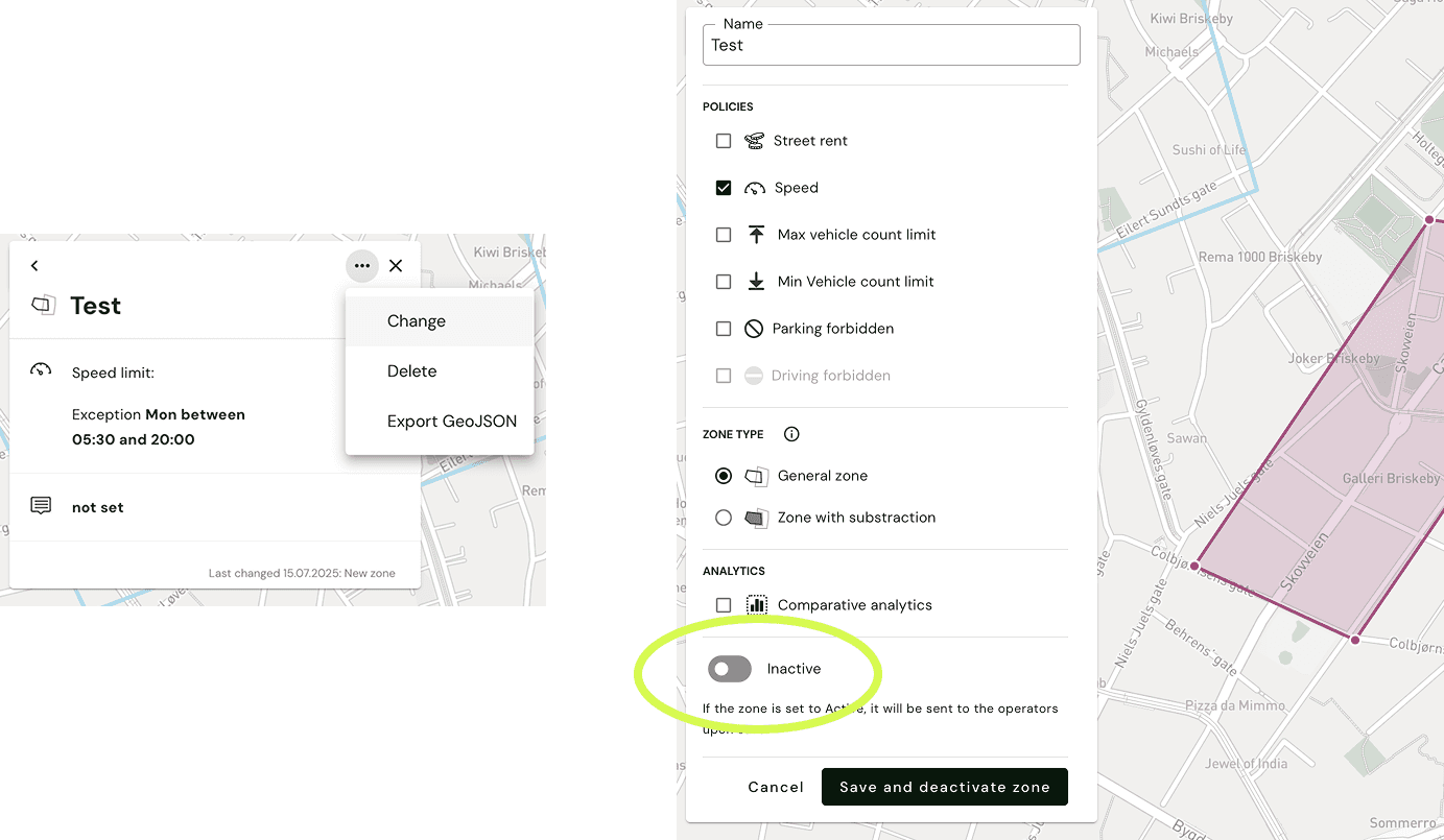 When the event is over, the zone must be deactivated, otherwise the speed limit will be activated again during the set time exception the following week. The zone can now be deleted or kept inactive. In the example below, the zone has been set as inactive.