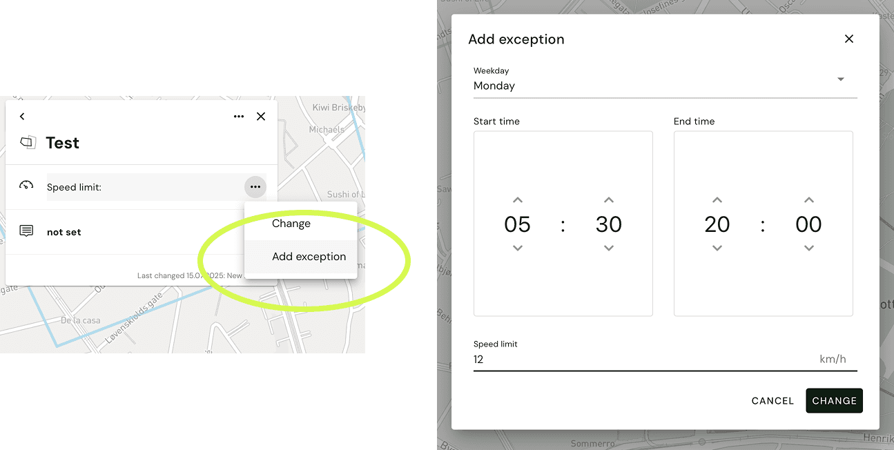 In order for the zone to apply for a given period of time, you have to ADD EXCEPTION to the zone. This tells the system that the zone is actually without rules - with the exception of - our temporary time period. In the example, we use the Event, and it is conceivable that a period from 05:30 to 20:00 on Monday is the time when the rule should apply. You then press CHANGE.